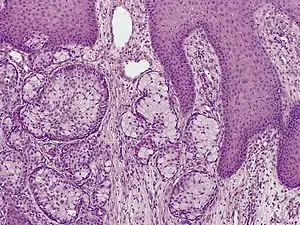 Eccrine carcinomas include porocarcinoma, hidradenocarcinoma, malignant spiradenoma carcinoma, malignant cylindroma, syringoid eccrine carcinoma, microcystic adnexal carcinoma, mucinous carcinoma, adenoid cystic carcinoma, and ductal papillary adenocarcinoma.[2] Other tumors not classified include eccrine ductal carcinoma, basaloid eccrine carcinoma, clear cell eccrine carcinoma and non-specified sweat gland carcinomas.[2]