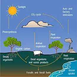 Cellular respiration is the overall relationship between autotrophs and heterotrophs. Autotrophs are organisms that produce their own food through the process of photosynthesis, whereas heterotrophs are organisms that cannot prepare their own food and depend on autotrophs for nutrition.[3] These two categories of living things work in coordination between photosynthesis and respiration as they both produce products that the other process utilizes. Cellular respiration happens when a cell takes glucose and oxygen and uses it to produce carbon dioxide, energy, and water. This transaction is important not only for the benefit of the cells, but for the carbon dioxide output provided, which is key in the process of photosynthesis. Without respiration, actions necessary to life, such as metabolic processes and photosynthesis, would cease. Ecosystem respiration is typically measured in the natural environment, such as a forest or grassland, rather than in the laboratory. Ecosystem respiration is the production portion of carbon dioxide in an ecosystem's carbon flux, while photosynthesis typically accounts for the majority of the ecosystem's carbon consumption.[4] Carbon is cycled throughout the ecosystem as various factors continue to uptake or release the carbon in different circumstances. Ecosystems take in carbon through photosynthesis, decomposition, and ocean uptake.[5] Ecosystems return this carbon through animal respiration, and plant respiration.[5] This constant cycle of carbon through the system is not the only element being transferred. In animal and plant respiration these living beings take in glucose and oxygen while emitting energy, carbon dioxide, and water as waste. These constant cycles provide for a influx of oxygen into the system and carbon out of the system.