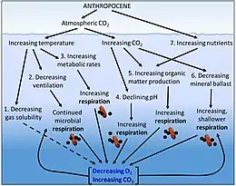 In natural ecosystems, the greatest utilization of carbon is through the uptake of carbon in photosynthesis and the second greatest utilization of carbon is through the release of carbon in cellular respiration.[6] minute changes to these two fluxes can have a larger effect on the carbon dioxide in the atmosphere.[7] These two processes have a significant effect on the atmospheric carbon dioxide concentration, making their correct functioning essential to sustaining life. Without carbon dioxide, plants would not be able to carry out photosynthesis, in turn not producing oxygen, affecting all forms of life on earth. Without the presence of ecosystem respiration throughout earth's systems, it is safe to say the basic idea of "life" would be lost. Prior to these processes in earth's early years of formation, the air and oceans were anoxic.[8] An anoxic environment is one without the presence of oxygen, majorly consisting of anaerobic microbes. The evolution of oxygenic photosynthesis in the atmosphere amplified the productivity of the biosphere, increasing biodiversity.[8] With the presence of photosynthesis providing oxygen to the atmosphere, respiration soon evolved to provide the necessary components photosynthesis demanded to function. This coevolution of photosynthesis and respiration processes has led us to the biodiverse and fruitful ecosystems we know today.