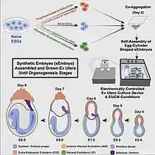 In 2022, Scientists of the Weizmann Institute of Science created early "embryo-like structures'" from mice stem cells.[6][7] The world's first synthetic embryo does not require sperm, eggs nor fertilization and were grown from only embryonic stem cells (ESCs) or also from stem cells other than ESCs.[6] The structure had an intestinal tract, early brain and a beating heart and a placenta with a yolk sac around the embryo.[6] The researchers said it could lead to better understanding of organ and tissue development, new sources of cells and tissues for human transplantation.[6] However, human synthetic embryos are a long ways off.[6] Their research was published by Cell on August 1, 2022.[5]