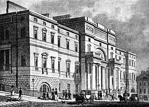 Extramural teaching resumed in the late 18th century. James Rae, a surgeon who became president of the RCSEd lectured on anatomy, surgery and dentistry at Surgeons' Hall from 1772.[10] From 1779 John Aitken began to teach classes in anatomy, physiology, surgery and midwifery at the Anatomical Theatre in Surgeons' Square, which was probably in Old Surgeons' Hall. The surgeon John Bell taught anatomy in his house in the square from 1787 and was joined then succeeded by his brother Charles Bell, later professor of surgery at the University of London. Their classes attracted large number of students as they taught surgical anatomy in contrast to Alexander Monro secundus, the university professor of anatomy, who was not a practising surgeon.[1]