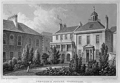 Medical education in Edinburgh is considered to have started in 1505 when the Incorporation of Barber Surgeons gained their Seal of Cause or Charter, which requested that, as was common practice elsewhere in Europe. a condemned man should be dissected each year in order that the surgical apprentices might learn anatomy.[3] The Incorporation appointed James Borthwick as a teacher of anatomy in 1647 and he, with Thomas Kincaid, instructed students in botany and pharmacy at the Incorporation's physic garden at Curryhill House.[4] A Royal Patent to teach anatomy was granted in 1694 and this led to the Incorporation building the first Surgeons Hall on the site of Curryhill House in what is now Surgeons’ Square. Opened in 1697 this included an anatomical theatre where public anatomy dissections were performed.[5] Among those participating in such dissections in the early 18th century were Archibald Pitcairne and Alexander Monteith.[5]