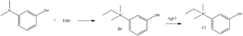 Edrophonium, ethyl-(3-hydroxyphenyl)dimethylammonium chloride, is made by reacting 3-dimethylaminophenol with ethyl bromide, which forms ethyl(3-hydroxyphenyl)dimethylammonium bromide, the bromine atom of which is replaced with a chlorine atom by reacting it with silver chloride, giving edrophonium.[5]