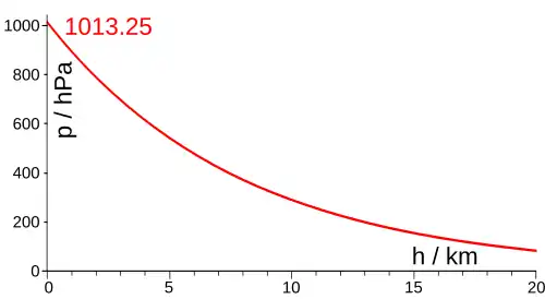 Atmospheric pressure decreases following the Barometric formula with altitude while the O2 fraction remains constant to about 100 km (62 mi), so pO2 decreases with altitude as well. It is about half of its sea-level value at 5,000 m (16,000 ft), the altitude of the Everest Base Camp, and only a third at 8,848 m (29,029 ft), the summit of Mount Everest.[8] When pO2 drops, the body responds with altitude acclimatization.[9]