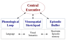 Working memory (WM), similar to STM, is the ability to temporarily store information in order to manipulate it for performing complex tasks, such as reasoning. WM is affected to a greater extent by stress than Long-term memory.[33] Stress has been shown to both improve and impair WM. In a study by Duncko et al., the positive effect of stress manifested itself as a decreased reaction time in participants, while the negative effect of stress causes more false alarms and mistakes when compared to a normal condition.[34] The researchers hypothesize that this could be representative of faster information processing, something helpful in a threatening situation. Anxiety has also been shown to adversely affect some of the components of WM, those being the phonological loop, the visuo-spatial sketchpad, and the central executive.[35] The phonological loop is used for auditory STM, the visuo-spatial sketchpad is used for visual and spatial STM, and the central executive links and controls these systems.[32] The disruption of these components impairs the transfer of information from WM to LTM, thus affecting learning. For instance, several studies have demonstrated that acute stress can impair working memory processing likely though reduced neural activity in the prefrontal cortex in both monkeys and humans.[36]