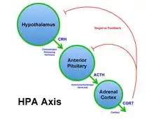 When a receptor within the body senses a stressor, a signal is sent to the anterior hypothalamus. At the reception of the signal, corticotrophin-releasing factor (CRF) acts on the anterior pituitary. The anterior pituitary in turn releases adrenocorticotropic hormone (ACTH).[13][14] ACTH induces the release of corticosteroids and aldosterone from the adrenal gland. These substances are the main factors responsible for the stress response in humans. Cortisol for example stimulates the mobilization of free fatty acids and proteins and the breakdown of amino acids, and increases serum glucose level and blood pressure,[12] among other effects.[15] On the other hand, aldosterone is responsible for water retention associated with stress. As a result of cells retaining sodium and eliminating potassium, water is retained and blood pressure is increased by increasing the blood volume.