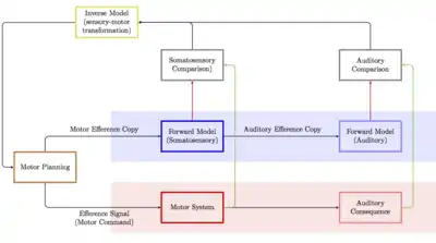 It has been argued that motor efference copies play an important role in speech production.[18] Tian and Poeppel propose that a motor efference copy is used to produce a forward model of somatosensory estimation, which entails an estimation of the articulatory movement and position of the articulators as a result of planned motor action.[19][18] A second (subsequent) auditory efference copy entails the estimation of auditory information as produced by the articulatory system in a second forward model. Both of these forward models can produce respective predictions and corollary discharge, which can in turn be used in comparisons with somatosensory and auditory feedback. Moreover, this system is thought by some to be the basis for inner speech, especially in relation to auditory verbal hallucinations.[20][21][22] In the case of inner speech, the efference signal is not sent or is inhibited before action takes place, leaving only the efference copy and leading to the perception of inner speech or inner hearing.[23] In the case of auditory verbal hallucinations, it is thought that a breakdown along the efference copy and forward model route creates a mismatch between what is expected and what is observed, leading to the experience that speech is not produced by oneself.[22][21] Recent studies suggest that efference copy already occurs when an acoustic signal is generated at the press of a button.[24] The differences in the ERP signal of the efference copy are so severe that machine learning algorithms can distinguish between schizophrenia patients and healthy control subjects, for example.[25] Efference copies also occur not only with spoken words, but with inner language - the quiet production of words.[26]