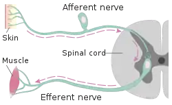 Efferent nerve fibers refer to axonal projections that exit a particular region; as opposed to afferent projections that arrive at the region. These terms have a slightly different meaning in the context of the peripheral nervous system (PNS) and central nervous system (CNS). The efferent fiber is a long process projecting far from the neuron's body that carries nerve impulses away from the central nervous system toward the peripheral effector organs (mainly muscles and glands). A bundle of these fibers is called an efferent nerve (if it connects to muscles, then it is a motor nerve[1]). The opposite direction of neural activity is afferent conduction,[2][3][4] which carries impulses by way of the afferent nerve fibers of sensory neurons.
