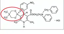 Efonidipine (INN) is a dihydropyridine calcium channel blocker marketed by Shionogi & Co. of Japan. It was launched in 1995, under the brand name Landel (ランデル). The drug blocks both T-type and L-type calcium channels.[1] Drug Controller General of India (DCGI) has approved the use of efonidipine in India.[2] It is launched under the brand name "Efnocar" (Zuventus Health care ltd, India).