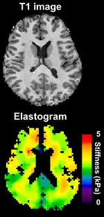 An anatomical MRI image of a brain (top) and an MRE elastogram of the same brain (bottom). The stiffness is in kPa of shear modulus.