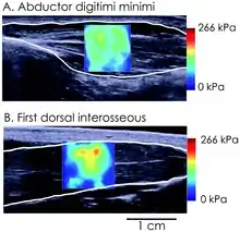 Supersonic shear imaging of the stiffness during contraction of the hand muscles abductor digiti minimi (A) and first dorsal interosseous (B). The scale is in kPa of shear modulus.