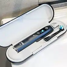 The Oral-B iO toothbrush has a linear magnetic drive system.[20] This system allows the concentration of energy to be at the tip of the brush bristles while using the oscillating rotating motion.[20] The brush also allows for 3D tracking using artificial intelligence that connects the toothbrush with an app.[20] This technology enables to the user to have instant feedback on their brushing efficacy and can track the data if the user wishes to bring the information to their dental professional for more personalized oral health instruction and education. Furthermore, the Oral-B iO toothbrush also has a smart pressure sensor which is electronically calibrated to let the user know if they are brushing with too much pressure, or not enough, and automatically adapts the oscillation speed to protect the teeth and gums when excess pressure is applied.[20]