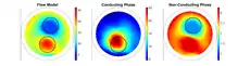 Knowing that a mixture will exhibit dielectric relaxation due to the MWS effect, this additional measuring dimension can be exploited to decompose multiphase flows when at least one of the phases is conducting. The figure to the right shows the reconstructed images of the flow model, conducting phase, and non-conducting phases extracted by exploited MWS effect from experimental data.