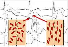 Prior to opening of the aortic valve, the red blood cells (erythrocytes) assume a random orientation (there is no blood flow in the aorta). When the electric current is applied from the outer electrodes, the current must circumference these red blood cells, therefore resulting in a higher voltage measurement, and thus, a lower conductivity. Shortly after aortic valve opening, the pulsatile blood flow forces the red blood cells to align in parallel with the blood flow. When the electric current is then applied, it is able to easily pass the red blood cells in the aorta resulting in a lower voltage, and thus, a higher conductivity. The change from random orientation to alignment of red blood cells upon opening of aortic valve generates a characteristic steep increase of conductivity or dZ(t) (corresponding to a steep decrease of impedance) – beat to beat.[3]