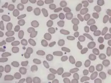 Elliptocytes, also known as ovalocytes or cigar cells, are abnormally shaped red blood cells that appear oval or elongated, from slightly egg-shaped to rod or pencil forms. They have normal central pallor with the hemoglobin appearing concentrated at the ends of the elongated cells when viewed through a light microscope. The ends of the cells are blunt and not sharp like sickle cells.[1]