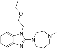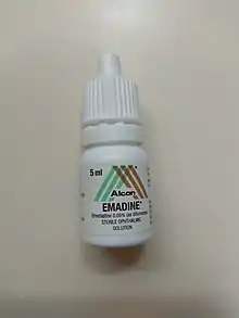 Emedastine (trade name Emadine) is a second generation antihistamine used in eye drops to alleviate the symptoms of allergic conjunctivitis.[1] It acts as a H1 receptor antagonist. It works by blocking the action of histamine that causes allergic symptoms. It is used in form of the difumarate.[2] The emedastine difumarate is a white, crystalline, water-soluble fine powder. Emedastine eye drops is usually applied twice a day to the affected eye. When the patients with allergic conjunctivitis were treated with 0.05% emedastine difumarate ophthalmic solution for six weeks, the signs and symptoms such as redness, itching and swelling of the eyes were relieved. Emedastine appears to be devoid of effects on adrenergic, dopaminergic and serotonin receptors. This drug was developed by Alcon, which is global medical company specializing in eye care products.