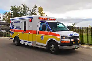 Alberta Health Services EMS Truck 3161. Most Ambulances in Canada use a GMC / Chevrolet cutaway van as their base.