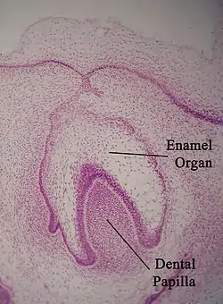 The enamel organ, also known as the dental organ, is a cellular aggregation seen in a developing tooth and it lies above the dental papilla.[1] The enamel organ which is differentiated from the primitive oral epithelium lining the stomodeum.The enamel organ is responsible for the formation of enamel, initiation of dentine formation, establishment of the shape of a tooth's crown, and establishment of the dentoenamel junction.[1]