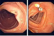 Endoclips have found a primary application in hemostasis (or the stopping of bleeding) during endoscopy of the upper (through gastroscopy) or lower (through colonoscopy) gastrointestinal tract.[1] Many bleeding lesions have been successfully clipped, including bleeding peptic ulcers,[4] Mallory-Weiss tears of the esophagus,[8] Dieulafoy's lesions,[9] stomach tumours,[10] and bleeding after removal of polyps.[11] Bleeding peptic ulcers require endoscopic treatment if they show evidence of high risk stigmata of re-bleeding, such as evidence of active bleeding or oozing on endoscopy or the presence of a visible blood vessel around the ulcer.[12][13] The alternatives to endoscopic clipping of peptic ulcers are thermal therapy (such as electrocautery to burn the vessel causing the bleeding), or injection of epinephrine to constrict the blood vessel. Comparative studies between endoclips and thermal therapy make the point that endoclips cause less trauma to the mucosa around the ulcer than electrocautery,[14] but no definitive advantage to either approach has reached consensus by gastroenterologists.[15][16]