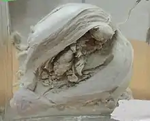 Approximately 40% of cases are related to obesity.[3] Endometrial cancer is also associated with excessive estrogen exposure, high blood pressure and diabetes.[1] Whereas taking estrogen alone increases the risk of endometrial cancer, taking both estrogen and a progestogen in combination, as in most birth control pills, decreases the risk.[1][3] Between two and five percent of cases are related to genes inherited from the parents.[3] Endometrial cancer is sometimes loosely referred to as "uterine cancer", although it is distinct from other forms of uterine cancer such as cervical cancer, uterine sarcoma, and trophoblastic disease.[9] The most frequent type of endometrial cancer is endometrioid carcinoma, which accounts for more than 80% of cases.[3] Endometrial cancer is commonly diagnosed by endometrial biopsy or by taking samples during a procedure known as dilation and curettage.[1] A pap smear is not typically sufficient to show endometrial cancer.[4] Regular screening in those at normal risk is not called for.[10]