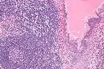 | High magnification micrograph of endosalpingiosis, showing the characteristic cystic spaces lined by a simple epithelium with cilia. H&E stain. | |