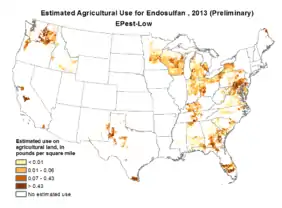 - 2002: The U.S. Fish and Wildlife Service recommended that endosulfan registration should be cancelled,[19] and the EPA determined that endosulfan residues on food and in water pose unacceptable risks. The agency allowed endosulfan to stay on the US market, but imposed restrictions on its agricultural uses.[14]