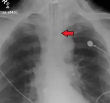 Ideally, at least one of the methods utilized for confirming tracheal tube placement will be a measuring instrument. Waveform capnography has emerged as the gold standard for the confirmation of tube placement within the trachea. Other methods relying on instruments include the use of a colorimetric end-tidal carbon dioxide detector, a self-inflating esophageal bulb, or an esophageal detection device.[36] The distal tip of a properly positioned tracheal tube will be located in the mid-trachea, roughly 2 cm (1 in) above the bifurcation of the carina; this can be confirmed by chest x-ray. If it is inserted too far into the trachea (beyond the carina), the tip of the tracheal tube is likely to be within the right main bronchus—a situation often referred to as a "right mainstem intubation". In this situation, the left lung may be unable to participate in ventilation, which can lead to decreased oxygen content due to ventilation/perfusion mismatch.[37]