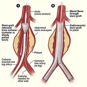 Endovascular aneurysm repair (EVAR) is a type of minimally-invasive endovascular surgery used to treat pathology of the aorta, most commonly an abdominal aortic aneurysm (AAA). When used to treat thoracic aortic disease, the procedure is then specifically termed TEVAR for "thoracic endovascular aortic/aneurysm repair." EVAR involves the placement of an expandable stent graft within the aorta to treat aortic disease without operating directly on the aorta. In 2003, EVAR surpassed open aortic surgery as the most common technique for repair of AAA,[1] and in 2010, EVAR accounted for 78% of all intact AAA repair in the United States.[2]