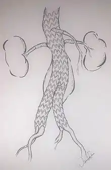 Thoracoabdominal aortic aneurysms (TAAA) involve the aorta in the chest and abdomen. As such, major branch arteries to the head, arms, spinal cord, intestines, and kidneys may originate from the aneurysm. An endovascular repair of a TAAA is only possible if blood flow to these critical arteries is preserved. Hybrid procedures offer one option, but a more direct approach involves the use of a branched endograft. However, the complex anatomy associated with the supra-aortic vessels is particularly difficult to accommodate with branched endograft devices.[17] Dr. Timothy Chuter pioneered this approach, with a completely endovascular solution. After partial deployment of the main body of an endograft, separate endograft limbs are deployed from the main body to each major aortic branch. This procedure is long, technically difficult, and currently only performed in a few centers. When the aneurysm begins above the renal arteries, neither fenestrated endografts nor "EndoAnchoring" of an infrarenal endograft is useful (an open surgical repair may be necessary). Alternatively, a "branched" endograft may be used. A branched endograft has graft limbs that branch off of the main portion of the device to directly provide blood flow to the kidneys or the visceral arteries.[18][19]