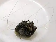 The treatment uses detachable coils made of platinum that are inserted into the aneurysm using the microcatheter. A variety of coils are available, including Guglielmi Detachable Coils (GDC) which are platinum, Matrix coils which are coated with a biopolymer, and hydrogel coated coils. Coils are also available in a variety of diameters, lengths, and cross sections.[16] A coil is first inserted along the aneurysm wall to create a frame, with the core then being filled with more coils.[17] A series of progressively smaller coils may also be used. Success is determined by injecting a contrast dye into parent artery and qualitatively determining if dye is flowing into the aneurysm space during fluoroscopy. If no flow is observed, the procedure is considered completed.[2] In the case of wide-necked aneurysms a stent may be used.[18]