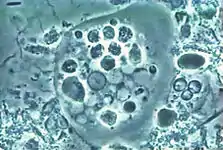 It is found in the mouth[5] inside the gingival pocket biofilm near the base of the teeth, and in periodontal pockets.[1] Entamoeba gingivalis is found in 95% of people with gum disease and rarely in people with healthy gums.[6][7] Cyst formation is not present; therefore transmission is direct from one person to another by kissing, or by sharing eating utensils. Only the trophozoites are formed and the size is usually 20 micrometers to 150 micrometers in diameter. Entamoeba gingivalis have pseudopodia that allow them to move quickly and phagocytise the nucleus of polynuclear neutrophils by exonucleophagy in periodontal disease.[8] Their spheroid nucleus is 2 micrometers to 4 micrometers in diameter and contains a small central endosome. There are numerous food vacuoles, which consists mostly of phagocitised PMN nucleus, blood cells, and bacteria. It also causes pyorrhoea.