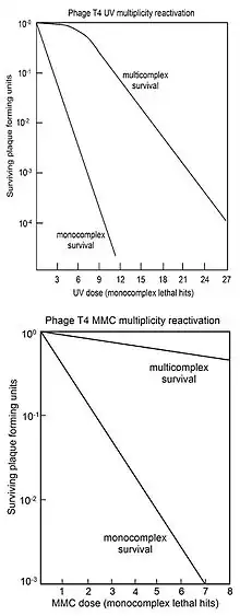 MR is usually represented by "survival curves" where survival of plaque forming ability of multiply infected cells (multicomplexes) is plotted against dose of genome damaging agent. For comparison, the survival of virus plaque forming ability of singly infected cells (monocomplexes) is also plotted against dose of genome damaging agent. The top figure shows the survival curves for virus T4 multicomplexes and monocomplexes with increasing dose of UV light. Since survival is plotted on a log scale it is clear that survival of multicomplexes exceeds that of monocomplexes by very large factors (depending on dose). The UV inactivation curve for multicomplexes has an initial shoulder. Other virus T4 DNA damaging agents with shoulders in their multicomplex survival curves are X-rays[33][34] and ethyl methane sulfonate (EMS).[27] The presence of a shoulder has been interpreted to mean that two recombinational processes are used.[35] The first one repairs DNA with high efficiency (in the "shoulder"), but is saturated in its ability as damage increases; the second pathway functions at all levels of damage. Surviving T4 virus released from multicomplexes show no increase in mutation, indicating that MR of UV irradiated virus is an accurate process.[35]
