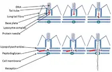 The T4 virus initiates an Escherichia coli infection by binding OmpC porin proteins and lipopolysaccharide (LPS) on the surface of E. coli cells with its long tail fibers (LTF).[15][16] A recognition signal is sent through the LTFs to the baseplate. This unravels the short tail fibers (STF) that bind irreversibly to the E. coli cell surface. The baseplate changes conformation and the tail sheath contracts, causing GP5 at the end of the tail tube to puncture the outer membrane of the cell.[17] The lysozyme domain of GP5 is activated and degrades the periplasmic peptidoglycan layer. The remaining part of the membrane is degraded and then DNA from the head of the virus can travel through the tail tube and enter the E. coli cell.