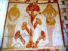 Fresco of Adam and Eve in the Garden of Eden, flanking an alleged "mushroom tree" at Plaincourault Chapel, a 12th-century chapel of the Knights Hospitaller in Mérigny, Indre, France.