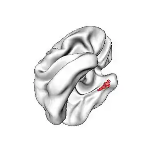In primates it is located at the rostral end of the temporal lobe and stretches dorsolaterally.