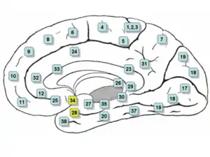 Medial surface. (Entorhinal cortex approximately maps to areas 28 and 34, at lower left.)