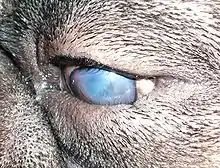 Entropion is a medical condition in which the eyelid (usually the lower lid) folds inward.[1] It is very uncomfortable, as the eyelashes continuously rub against the cornea causing irritation. Entropion is usually caused by genetic factors. This is different from when an extra fold of skin on the lower eyelid causes lashes to turn in towards the eye (epiblepharon).[2] In epiblepharons, the eyelid margin itself is in the correct position, but the extra fold of skin causes the lashes to be misdirected. Entropion can also create secondary pain of the eye (leading to self trauma, scarring of the eyelid, or nerve damage). The upper or lower eyelid can be involved, and one or both eyes may be affected. When entropion occurs in both eyes, this is known as "bilateral entropion". Repeated cases of trachoma infection may cause scarring of the inner eyelid, which may cause entropion.[3] In human cases, this condition is most common to people over 60 years of age.[4]