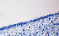 The ependyma is the thin neuroepithelial (simple columnar ciliated epithelium) lining of the ventricular system of the brain and the central canal of the spinal cord.[1] The ependyma is one of the four types of neuroglia in the central nervous system (CNS). It is involved in the production of cerebrospinal fluid (CSF), and is shown to serve as a reservoir for neuroregeneration.
