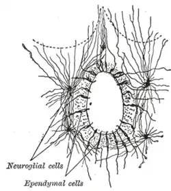 The ependyma is made up of ependymal cells called ependymocytes, a type of glial cell. These cells line the ventricles in the brain and the central canal of the spinal cord, which become filled with cerebrospinal fluid. These are nervous tissue cells with simple columnar shape, much like that of some mucosal epithelial cells.[2] Early monociliated ependymal cells are differentiated to multiciliated ependymal cells for their function in circulating cerebrospinal fluid.[3]