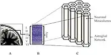 Ephaptic coupling is a form of communication within the nervous system and is distinct from direct communication systems like electrical synapses and chemical synapses. It may refer to the coupling of adjacent (touching) nerve fibers caused by the exchange of ions between the cells, or it may refer to coupling of nerve fibers as a result of local electric fields.[1] In either case ephaptic coupling can influence the synchronization and timing of action potential firing in neurons. Myelination is thought to inhibit ephaptic interactions.[2]