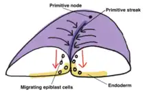 Upon commencement of gastrulation, the primitive streak, a visible, morphological linear band of cells, appears on the posterior epiblast and orients along the anterior-posterior embryo axis. Initiated by signals from the underlying hypoblast, formation of the primitive streak is predicated on epiblast cell migration, mediated by Nodal, from the lateral-posterior regions of the epiblast to the center midline.[6] The primitive node is situated at the anterior end of the primitive streak and serves as the organizer for gastrulation, determining epiblast cell fate by inducing the differentiation of migrating epiblast cells during gastrulation.