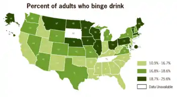 The population of people who binge drink mainly comprises young adults aged 18–29, although it is by no means rare among older adults. For example, in 2007 (using a 5-drinks definition per occasion for both genders), 42% of 18- to 25-year-olds "binged" at least once a month, while 20% of 16–17-year-olds and 19% of those over age 35 did so.[31] The peak age is 21. Prevalence varies widely by region, with the highest rates being in the North Central states.[32] Binge drinking is more common in men than it is in women.[2]