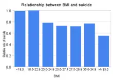 However, other studies indicate that suicide rates increase with extreme obesity, and it is difficult to control for conflating factors such as BMI-related differences in longevity, which have a significant bearing on suicide rates.[52]