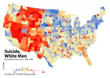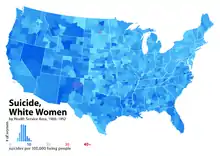 Between 1999 and 2006, in the United States, suicide was the third leading cause of death in adolescents aged 15 to 19 years, and the fourth leading cause of death for children aged 10 to 14 years.[17] As of 2011, suicide increased in this age group, becoming the second cause of death for youth between the ages of 15 and 24 years, below homicide statistics and above those of accidents.[18] Geographically within the United States, western states have higher rates of suicide. Per 100,000 people, Montana is ranked first, Alaska ranked second, and Wyoming is third.[19] There may be a link between these states and firearm regulations, which make access to guns easier, as statistics show firearm suicides in states with the highest rates of gun ownership are 3.7 times higher for men, and 7.9 times higher for women.[20] These are often rural areas without heavily populated urban communities (which brings social pressure stressors), but may indicate a lack of accessibility to medical and psychological health assistance in these remote areas.[21][22]