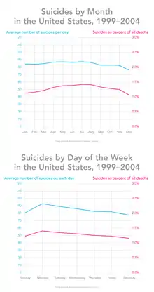 The variation in suicides by day of the week is greater than any seasonal variation.[58]