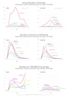 Differences in suicide rates between genders are prominent, with males dying by suicide at a higher rate in almost every country in the world.[3] However, females of all age groups tend to show higher rates of reported nonfatal suicidal behaviors.