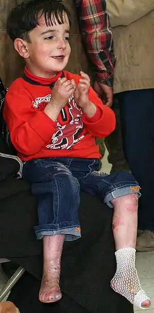 The condition was brought to public attention in 2004 in the UK through the Channel 4 documentary The Boy Whose Skin Fell Off, chronicling the life and death of Jonny Kennedy, an Englishman with EB.[43] In the United States, HBO ran a documentary, My Flesh and Blood, in 2003. Additionally, the film Butterfly Girl follows Abigail Evans with the disease.[44] In Canada, The Sports Network's award-winning documentary on Jonathan Pitre led to extensive coverage on the boy's disease, treatment, and death.[45][46]