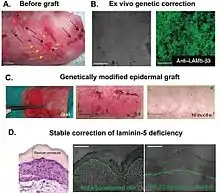 A 2017 clinical trial with male RDEB (recessive dystrophic EB) patients conducted successful grafting of type VII gene corrected keratinocytes (COL7A1 gene correction using retrovirus transduction), without any serious adverse effects. Type VII collage formation was observed at the dermis-epidermis junction in significant amounts.[30]