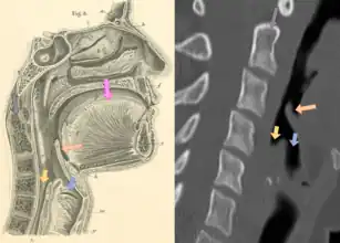 Drawing (left image) and CT scan (right image) of the normal pharynx as a cross-section viewed from the side (sagittal view), including the normal epiglottis (orange arrow), opening to the esophagus (yellow arrow), and opening to the trachea (blue arrow). An infected epiglottis becomes swollen and causes issues with swallowing, speaking, and breathing due to its proximity to the esophagus and trachea. Other labeled structures include the tongue (pink arrow) and vertebral bodies of the cervical spine (grey arrow)