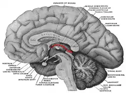 ![]() Mesial aspect of a brain sectioned in the median sagittal plane. Epithalamus labeled in red, by "habenular commissure", "pineal body", and "posterior commissure", with its projection anteriorly consisting stria medullaris | |